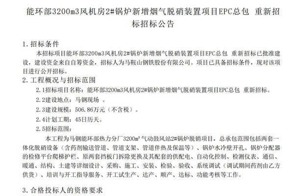 能环部3200m3风机房2#锅炉新增烟气脱硝装置项目EPC总包 重新招标招标公告 1.招标条件 本招标项目能环部3200m3风机房2#锅炉新增烟气脱硝装置项目EPC总包 重新招标已批准建设,建设资金来自自筹资金,招标人为马鞍山钢铁股份有限公司。项目已具备招标条件,现对该项目进行公开招标。 2.工程概况与招标范围 2.1招标项目名称...