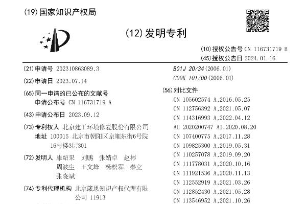 2024年1月16日,国家知识产权局发布发明授权公告,北京建工环境修复股份有限公司取得“循环式磁性锰基汞污染土壤修复剂及其制备方法和应用”发明专利,授权公告号CN116731719B,申请日期为2023年7月。 专利摘要显示,本发明属于污染土壤修复技术领域,涉及一种循环式磁性锰基汞污染土壤修复剂的制备方法,包...