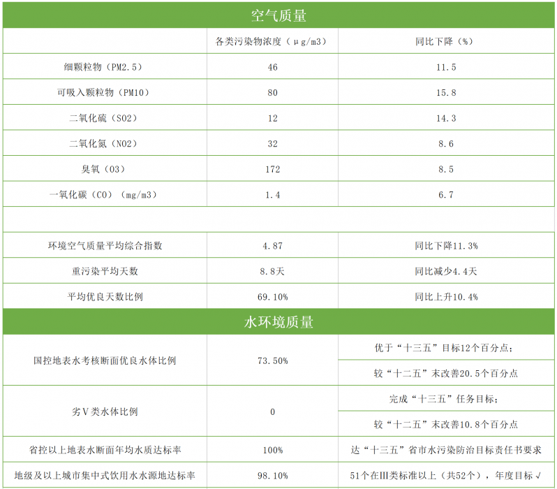 导读:PM2.5年均浓度和优良天数比例较2015年分别改善37%和14.2个百分点,超额完成国家下达的“十三五”目标;24家钢铁企业完成超低排放改造;全省直径3米以下燃料类煤气发生炉全部完成淘汰;5200余家涉VOCs企业完成综合治理和提标改造工作;16设区市城市建成区内的166个黑臭水体均已完成整治并通过省级“长制久清”评估,完成...