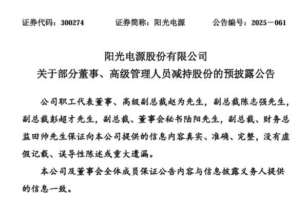 7月25日,光伏与储能巨头阳光电源股份有限公司(简称:阳光电源)公告称,因个人资金需求,公司职工代表董事、高级副总裁赵为先生,副总裁陈志强先生,副总裁彭超才先生,副总裁、董事会秘书陆阳先生,副总裁、财务总监田帅先生,计划减持本公司股份合计不超过329,700股,占目前公司总股本的0.0161%。交易将以集中竞价或大宗交易方式进行。图源...