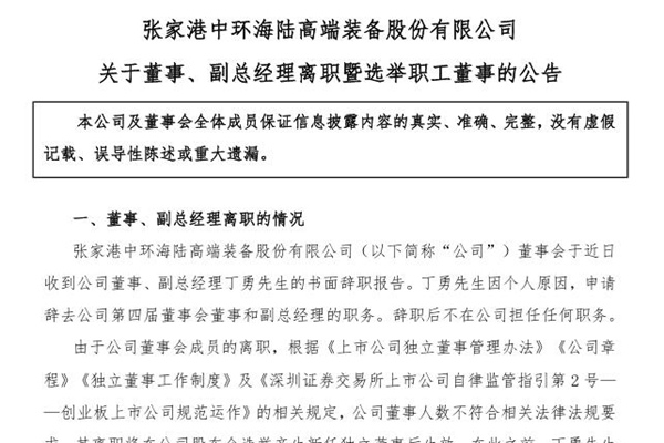 2025年07月07日,张家港中环海陆高端装备股份有限公司发布《关于董事、副总经理离职暨选举职工董事的公告》。图源:中环海陆公告 公司董事、副总经理丁勇先生因个人原因,申请辞去公司第四届董事会董事和副总经理的职务。 为保障公司董事会正常运作,根据《公司法》《深圳证券交易所上市公司自律监管指引第2号—创业板上市公司规范运...
