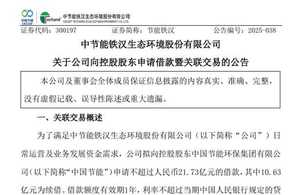 中节能铁汉生态环境股份有限公司(节能铁汉)近日公告称,为了满足公司日常运营及业务发展资金需求,公司拟向控股股东中国节能环保集团有限公司(下称“中国节能”)申请不超过人民币21.73亿元的借款,其中10.63亿元为续借。借款额度有效期1年,利率不超过当期中国人民银行规定的贷款利率标准(LPR),目前为3.0%,公...