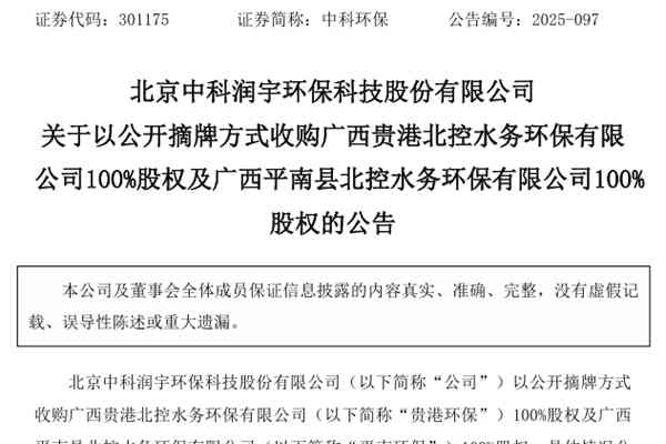 7月1日晚间,北京中科润宇环保科技股份有限公司(简称:中科环保)发布公告,公司以公开摘牌方式成功竞得北控水务集团有限公司旗下广西贵港北控水务环保有限公司(下称“贵港环保”)100%股权及广西平南县北控水务环保有限公司(下称“平南环保”)100%股权,成交价格分别为人民币30,267.00...