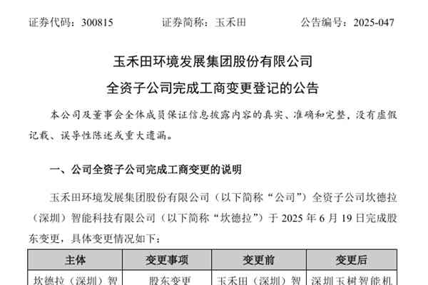 玉禾田环境发展集团股份有限公司(简称:玉禾田)公告称,全资子公司坎德拉(深圳)智能科技有限公司(下称“坎德拉”)已经于2025年6月19日完成股东变更,具体变更情况如下:图源:玉禾田公告 据悉,深圳玉树智能机器人有限公司(下称“玉树智能”)也是玉禾田的全资子公司,是其切入高端智能装备及...
