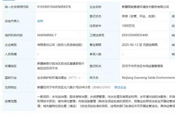 近日,新疆高能赛德环境技术服务有限公司成立,法定代表人为安林,注册资本为1000万元,经营范围包含:水污染治理;固体废物治理;水资源管理;污水处理及其再生利用;水环境污染防治服务;环保咨询服务;工程管理服务等。 股权穿透显示,该公司由新疆赛德环保科技服务有限公司、高能环境旗下天津高能时代水处理科技有限公司共同持股。图源:企查查...