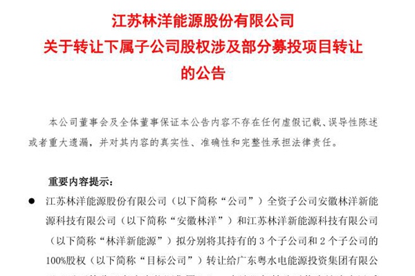 2025年06月03日,江苏林洋能源股份有限公司发布《关于转让下属子公司股权涉及部分募投项目转让的公告》。图源:林洋能源公告 林洋能源全资子公司安徽林洋新能源科技有限公司和江苏林洋新能源科技有限公司拟分别将其持有的3个子公司和2个子公司的100%股权转让给广东粤水电能源投资集团有限公司,转让对价合计为人民币47,093.85 万元,...