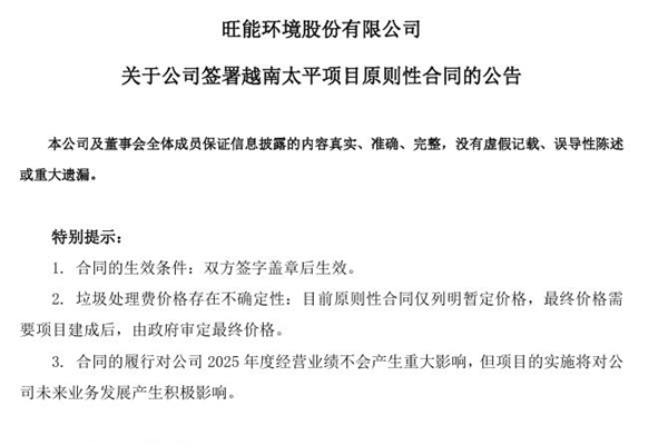 2025年06月04日,旺能环境股份有限公司发布《关于公司签署越南太平项目原则性合同的公告》。图源:旺能环境公告 近日,旺能环境股份有限公司、控股子公司龙兴绿色能源有限公司、合资方Dragonventures 投资开发股份公司和越南社会主义共和国太平省人民委员会代表太平省农业与环境厅在太平省共同签署了《生活固体废物处理服务原则性合同...