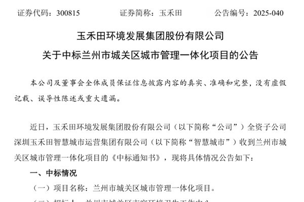 玉禾田环境发展集团股份有限公司(简称:玉禾田)近日公告称,公司全资子公司深圳玉禾田智慧城市运营集团有限公司(下称“智慧城市”)已经收到兰州市城关区城市管理一体化项目的《中标通知书》,该项目作业服务补贴总额35298.755541万元/年,存量经营权转让价3898.59万元,服务年限15年。 玉禾田表示,该项目...
