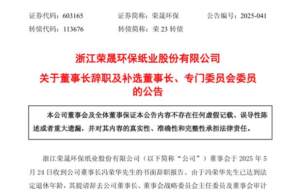 5月27日,浙江荣晟环保纸业股份有限公司(简称:荣晟环保)发布公告称,公司董事长冯荣华先生因达到法定退休年龄,于5月24日辞职,辞职后,冯荣华先生不在公司担任任何职务。 荣晟环保董事会同意补选冯晟宇先生为公司第八届董事会董事长和第八届董事会战略委员会主任委员,根据《公司法》《公司章程》的有关规定,将由冯晟宇先生担任公司的法定代表人。...