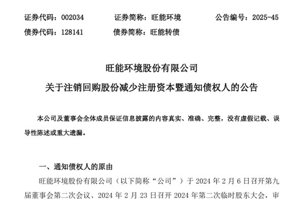 旺能环境股份有限公司(简称:旺能环境)近日公告称,公司于2025年4月16日召开第九届董事会第九次会议、2025年5月23日召开2024 年度股东大会,审议通过《关于变更公司注册资本、修改公司章程和办理工商变更登记的议案》,同意公司减少注册资本并修改《公司章程》。 据悉,自2024年7月5日首次回购股份至2024年11月4日实施完毕...