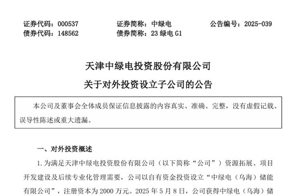 天津中绿电投资股份有限公司(简称:中绿电)公告称,为满足公司资源拓展、项目开发建设及后续专业化管理需要,公司以自有资金投资设立“中绿电(乌海)储能有限公司”,注册资本为2000万元。2025年5月8日,中绿电已获得中绿电(乌海)储能有限公司营业执照。 中绿电表示,公司投资设立中绿电(乌海)储能有限公司,旨在满...