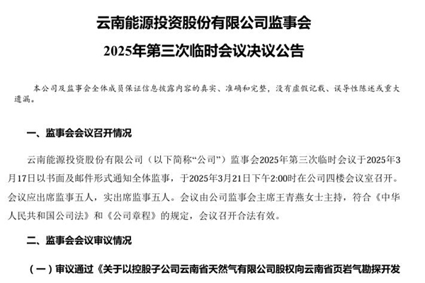 2025年03月22日,云南能源投资股份有限公司发布《 2025年第三次临时会议决议公告》。图源:云南能投公告 审议通过《关于以控股子公司云南省天然气有限公司股权向云南省页岩气勘探开发有限公司增资暨关联交易的议案》。 审议通过《关于投资建设云南省盐业有限公司昆明盐矿分布式光伏发电项目的议案》。 申明:本站发布此信息的目的在于传播...