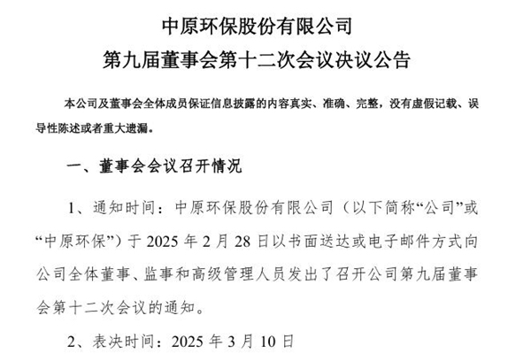 2025年03月12日,中原环保股份有限公司发布《第九届董事会第十二次会议决议公告》。图源:中原环保公告 董事会会议审议通过《关于郑州智碳科技有限公司投资建设郑州新区污水处理厂沼气发电综合利用项目的议案》,审议通过《关于郑州智碳科技有限公司投资建设中原环保股份有限公司源网荷储微电网电站项目的议案》,审议通过《关于制订的议案》。 ...