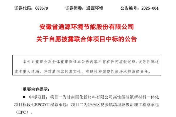 安徽省通源环境节能股份有限公司 (简称:通源环境)近日自愿披露联合体项目中标消息↓ 中标项目:项目一为甘肃巨化新材料有限公司高性能硅氟新材料一体化项目标段七EPCO工程总承包;项目二为岱岳区夏张镇填埋垃圾治理工程总承包(EPC)。 中标金额:项目一中标金额为92,493.62万元,项目二拟中标金额为10,752.16万元...
