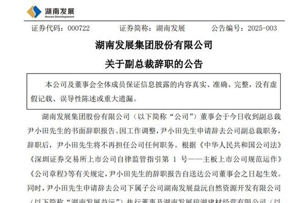 湖南发展集团股份有限公司(简称:湖南发展)近日公告称,公司董事会已收到副总裁尹小田先生的书面辞职报告。因工作调整,尹小田先生申请辞去公司副总裁职务,辞职后,尹小田先生将不再担任公司任何职务。湖南发展表示,截至本公告披露日,尹小田先生未持有公司股份,尹小田先生辞去副总裁职务不会对公司正常生产经营活动产生影响。 湖南发展的主业包括清洁能...