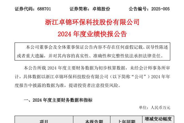浙江卓锦环保科技股份有限公司(简称:卓锦股份)近日发布《2024年度业绩快报公告》。快报显示,卓锦股份2024年实现营业总收入2.41亿元,同比减少30.63%;营业利润为-8722万元,同比增长30.53%;利润总额为-8750万元,同比增长32.47%。归母净利润约亏损8309万元,同比增长31.26%。归母净利润扣除非经常性损益...
