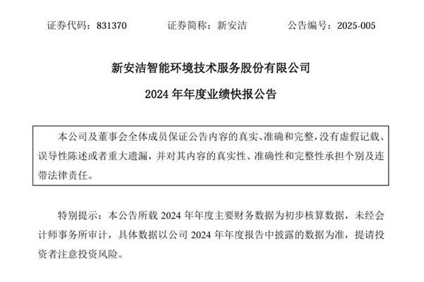 新安洁智能环境技术服务股份有限公司(简称:新安洁)近日发布《2024 年年度业绩快报公告》。快报显示,新安洁2024年实现营业收入4.69亿元,同比下降19.49%;利润总额人民币-5385.46万元,比上年同期增长8.87%;净利润-5094.41万元,同比增长6.23%。 新安洁成立于2011年,是一家以环境卫生为主营业务的上市...