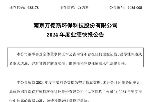 南京万德斯环保科技股份有限公司(简称:万德斯)近日发布《2024 年度业绩快报公告》。快报显示,万德斯2024年实现营业总收入6.21亿元,同比下降23.35%;归属于母公司股东的净利润-6821.23万元,同比亏损减少1842.03万元;基本每股收益为-0.8025元;归属于母公司股东的每股净资产为12.23元。 万德斯的主营业务...