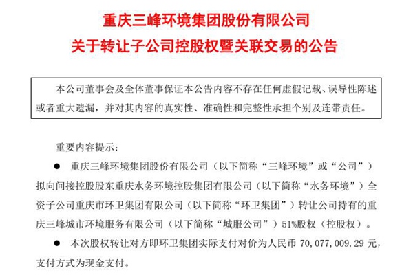 2025年01月24日,重庆三峰环境集团股份有限公司发布《关于转让子公司控股权暨关联交易的公告》。图源:三峰环境公告 公告称,重庆三峰环境集团股份有限公司拟向间接控股股东重庆水务环境控股集团有限公司全资子公司重庆市环卫集团有限公司转让公司持有的重庆三峰城市环境服务有限公司51%股权(控股权)。本次股权转让对方即环卫集团实际支付对价为...
