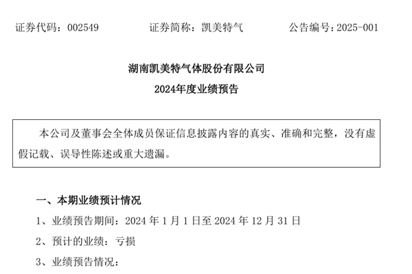 湖南凯美特气体股份有限公司2024年度业绩预告近日发布。凯美特气预计2024年全年归属于上市公司股东的净利润亏损4380万元-5400万元;扣除非经常性损益后的净利润亏损110万元-210万元。详情如下:业绩亏损/变动的主要原因: (1)2024 年终止实施 2022 年限制性股票激励计划,确认股份支付费用8,740.36 万元,计...