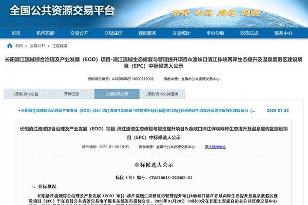 2025年1月20日,长阳清江流域综合治理及产业发展(EOD)项目-清江流域生态修复与管理提升项目&渔峡口清江伴峡两岸生态提升及温泉度假区建设项目(EPC)中标候选人公示。 中标候选人名称: 中建三局集团有限公司、中国市政工程中南设计研究总院有限公司、中移建设有限公司、湖北嵘古建设工程有限公司联合体——报价...