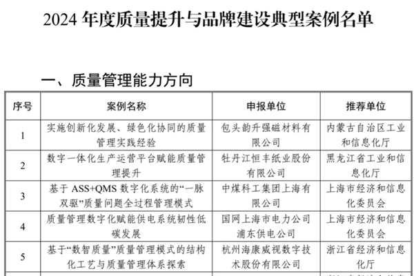 2025年1月9日,工业和信息化部办公厅发布《2024年度质量提升与品牌建设典型案例名单》,合计100个。 包头韵升强磁的实施创新化发展、绿色化协同的质量管理实践经验,晶科能源的基于“四维三绿”的低碳质量管理模式,丹东奥龙的基于AI的新能源汽车智能检测系统创新应用,福建安通的高效传导新能源汽车整车线束轻量化研...