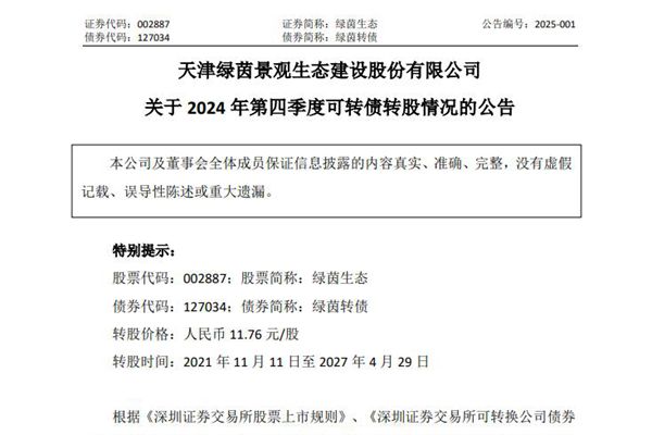 天津绿茵景观生态建设股份有限公司(简称:绿茵生态)近日发布《关于 2024 年第四季度可转债转股情况的公告》。 公告显示,绿茵生态于 2021年 4 月 30 日公开发行了 712 万张可转换公司债券,每张面值 100 元,发行总额71,200.00 万元。2024 年第四季度,绿茵转债因转股减少数量 13,200 元(132 张)...