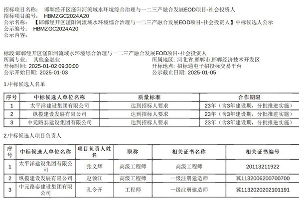 2025年1月3日,【邯郸经开区滏阳河流域水环境综合治理与一二三产融合发展EOD项目-社会投资人】中标候选人公示,分别为太平洋建设集团有限公司、纵揽建设发展有限公司、中元路泰建设集团有限公司。 该项目包含三个子项目,(1)滏阳河流域经开区内生态河生态修复及整体提升项目;(2)经开区生态工业体系建设(一期)项目;(3)沿河生态康养及都...