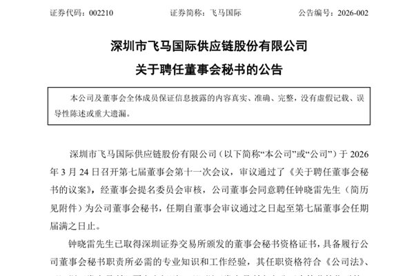 深圳市飞马国际供应链股份有限公司(简称:飞马国际)近日公告称,经董事会提名委员会审核,公司董事会同意聘任钟晓雷先生为公司董事会秘书,任期自董事会审议通过之日起至第七届董事会任期届满之日止。 钟晓雷,男,1979年出生,中国国籍,无境外永久居留权,西南财经大学管理学学士、会计学硕士研究生,已取得深圳证券交易所颁发的董事会秘书资格证书。...