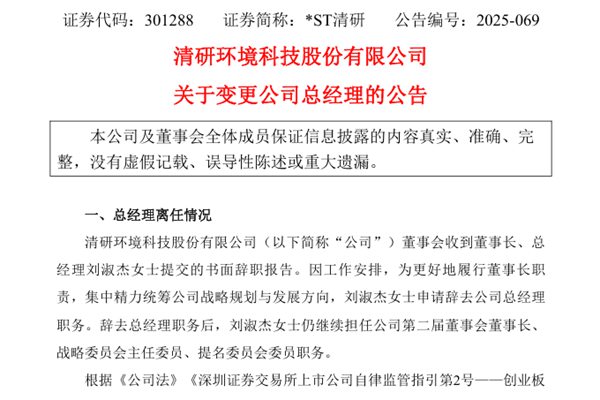 清研环境科技股份有限公司(简称:*ST清研,下称“清研环境”)公告称,公司董事会收到董事长、总经理刘淑杰女士提交的书面辞职报告。因工作安排,为更好地履行董事长职责,集中精力统筹公司战略规划与发展方向,刘淑杰女士申请辞去公司总经理职务。辞去总经理职务后,刘淑杰女士仍继续担任公司第二届董事会董事长、战略委员会主任委...
