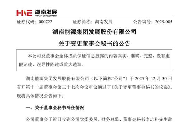 湖南能源集团发展股份有限公司(简称:湖南发展)公告称,公司董事会于近日收到公司党委委员、财务总监、董事会秘书李志科先生辞任董事会秘书的报告。因工作调整,李志科先生申请辞任公司董事会秘书职务。在辞任该职务后,李志科先生仍继续担任公司党委委员、财务总监职务。截至本公告披露日,李志科先生未持有公司股份。李志科先生辞任董事会秘书职务不会对公司...