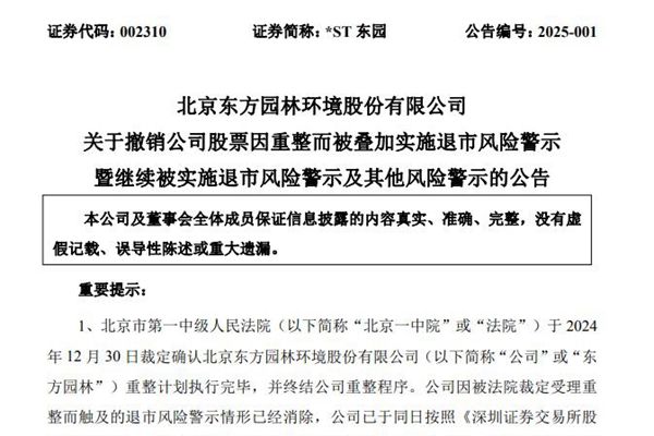 北京东方园林环境股份有限公司(简称:*ST东园,下称“东方园林”)近日公告称,1月2日,公司已收到深交所通知,深交所同意公司撤销因重整而被实施退市风险警示的申请。鉴于东方园林仍存在其他触及退市风险警示和其他风险警示的情形,其股票将继续被深交所实施退市风险警示和其他风险警示,公司股票简称仍为“*ST ...