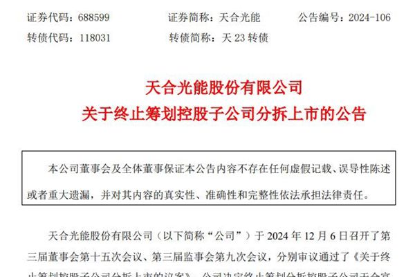 A股上市公司天合光能股份有限公司(简称:天合光能)12月9日公告称,公司召开的第三届董事会第十五次会议、第三届监事会第九次会议已分别审议通过了《关于终止筹划控股子公司分拆上市的议案》,因此公司决定终止筹划分拆控股子公司天合富家能源股份有限公司(下称“天合富家”,原名为江苏天合智慧分布式能源有限公司)上市事宜。 ...