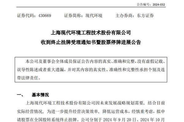 上海现代环境工程技术股份有限公司(简称:现代环境)11月8日公告称,公司于11月6日向全国股转公司提交了终止挂牌的申请材料,经审查,全国股转公司作出了同意受理的决定,并向公司出具了编号为ZZGP2024110004 的《受理通知书》。 据悉,为进一步提升经营决策效率, 降低运营成本,现代环境已申请股票在全国股转系统终止挂牌。现代环境...