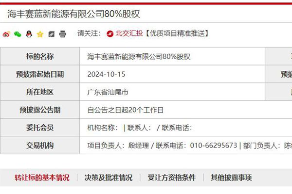 10月15日,北京产权交易所网站显示,中核汇能有限公司挂牌转让持有的海丰赛蓝新能源有限公司(下称“海丰赛蓝新能源”)80%股权,该公司拥有一座200MW光伏电站。信息披露公告期为2024年10月15日 至 2024年11月11日。 海丰赛蓝新能源成立于2019年11月1日,注册资本1000万元。由中核汇能有限...