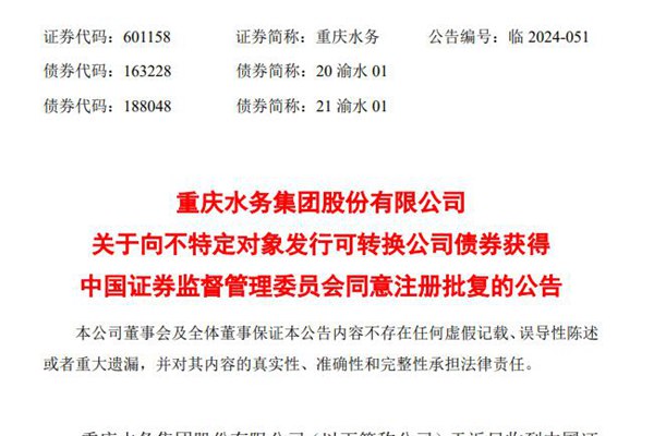 重庆水务集团股份有限公司(简称:重庆水务)9月25日晚间公告称,公司于近日收到中国证监会出具的有关批复(证监许可〔2024〕1294号),同意公司向不特定对象发行可转换公司债券的注册申请,本次发行应严格按照报送上海证券交易所的申报文件和发行方案实施,有效期12个月。据悉,今年6月21日,上海证券交易所上市审核委员2024年第17次会议...