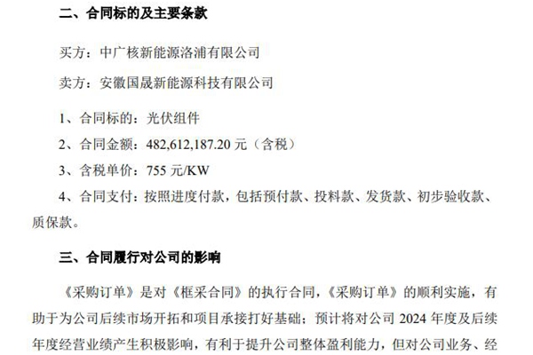 2024年9月25日,国晟世安科技股份有限公司发布《关于签订特别重大合同的进展公告》。图源:国晟世安科技股份有限公司公告 公告显示,国晟科技二级控股子公司安徽国晟新能源科技有限公司与中广核全资子公司中广核新能源洛浦有限公司就《中广核新能源 2023 至 2024 年光伏组件框架集采(7 标)光伏组件采购合同》签订了部分《采购订单》。...