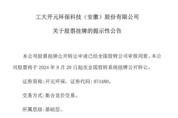 工大开元环保科技(安徽)股份有限公司(简称:开元环保)近日发布公告称,公司股票将于2024年9月20日起在全国股转系统挂牌公开转让,交易方式为集合竞价交易。 据悉,开元环保成立于2016年,注册资本3929.057万元,主营业务包括环境治理综合解决方案、环境治理运维及技术服务和循环水处理三大板块,客户覆盖石化、医药、农药、煤炭和新能...