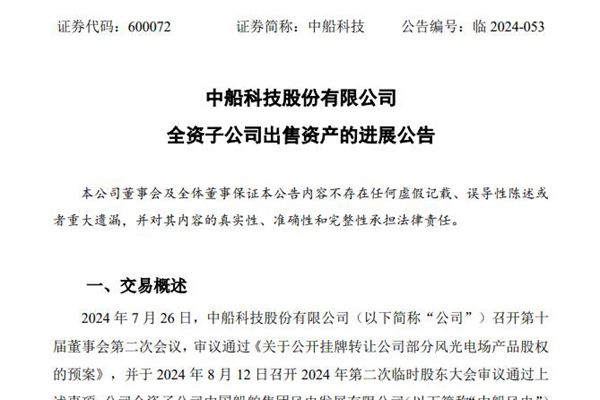 8月12日,中船科技股份有限公司(简称:中船科技)全资子公司分别以不低于评估值的首次挂牌价格在产权交易所公开挂牌转让中船润泽沽源新能源有限公司65%股权、哈密海新能源有限公司100%股权、吉木乃县海为风电有限公司100%股权、尉犁海为新能源有限公司100%股权、乌鲁木齐市海为风电有限公司100%股权。 9月21日,中船科发布《全资子...