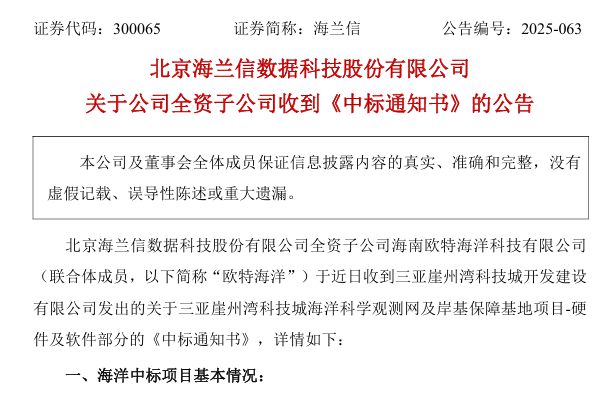 北京海兰信数据科技股份有限公司(简称:海兰信)近日公告称,全资子公司海南欧特海洋科技有限公司(联合体成员)已收到三亚崖州湾科技城开发建设有限公司发出的关于三亚崖州湾科技城海洋科学观测网及岸基保障基地项目-硬件及软件部分的《中标通知书》。 项目基本情况 1、招标项目名称:三亚崖州湾科技城海洋科学观测网及岸基保障基地项目硬件及软件部分...