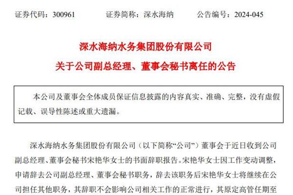 深水海纳水务集团股份有限公司(简称:深水海纳)近日公告称,公司董事会于近日收到副总经理、董事会秘书宋艳华女士的书面辞职报告,宋艳华女士因工作变动调整,申请辞去公司副总经理、董事会秘书职务,辞去该职务后宋艳华女士将继续在公司担任其他职务,其辞职不会影响公司相关工作的正常进行,其原定高管任期至2025 年 10 月 14 日第三届董事会期...