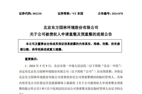 2024年5月7日,知名环保上市企业北京东方园林环境股份有限公司(简称:*ST东园,下沉“东方园林”)披露了《关于公司被债权人申请重整及预重整的提示性公告》,引起业界广泛关注。公告显示,因为东方园林不能清偿到期债务且明显缺乏清偿能力,但具有重整价值,所以其间接控股股东及最大债权人北京朝阳国有资本运营管理有限公司...