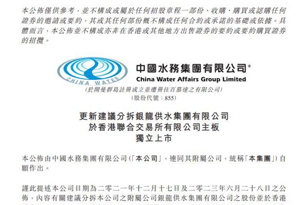 9月11日,港股上市公司中国水务集团有限公司(简称:中国水务)公告称,经审慎考虑发展策略及近期资本市场环境后,公司已决定暂停建议分拆附属公司银龙供水集团有限公司(下称“银龙供水”)于香港联合交易所有限公司主板独立上市的计划,预计不会对公司财务状况或营运造成重大不利影响。 据悉,中国水务在2023年6月28日公...
