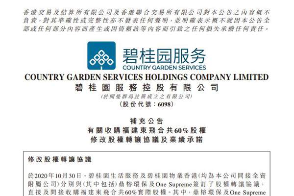 碧桂园服务控股有限公司(简称:碧桂园服务)日前发布公告称,由于福建东飞(即“福建东飞环境集团有限公司”)未能达成股权协议所载的业绩承诺,转让方One Supreme将根据协议采用股权补偿的方式进行支付,并将其持有的至诚投资25%股权无偿转让给碧桂园物业香港。由于至诚投资持有福建东飞30%股份,碧桂园服务将通过此...