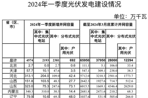 国家能源局近日公布了《2024年一季度光伏发电建设情况》,新增并网容量4574万千瓦,其中集中式光伏电站2193万千瓦、分布式光伏2381万千瓦、户用光伏692万千瓦;截至3月底累计并网容量65950万千瓦,其中集中式光伏电站37950万千瓦、分布式光伏28000万千瓦、户用光伏12294万千瓦。...