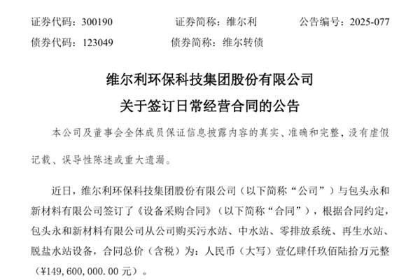 维尔利环保科技集团股份有限公司(简称:维尔利)公告称,近日,公司与包头永和新材料有限公司签订了《设备采购合同》(下称“合同”),根据合同约定,包头永和新材料有限公司从公司购买污水站、中水站、零排放系统、再生水站、脱盐水站设备,合同总价(含税)为:人民币(大写)壹亿肆仟玖佰陆拾万元整(¥149,600,0...