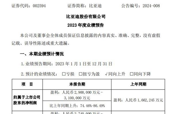 1月29日,比亚迪股份有限公司发布2023年度业绩预告,报告显示,期内公司实现归属于上市公司股东的净利润290亿元-310亿元,较上年同期上升74.46%-86.49%,扣除非经常性损益后的净利润274亿元-297亿元,比上年同期上升75.22%-89.92%;基本每股收益9.98元至10.67元。 在销量方面,比亚迪汽车2023年...
