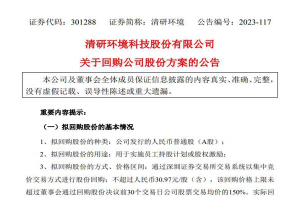 11月14日,清研环境科技股份有限公司(简称:清研环境)发布《关于回购公司股份方案的公告》,拟回购公司发行的人民币普通股(A股),用于实施员工持股计划或股权激励。 回购将通过深圳证券交易所交易系统以集中竞价交易方式进行,不超过人民币30.97元/股(含),该回购价格上限未超过董事会通过回购股份决议前30个交易日公司股票交易均价的15...