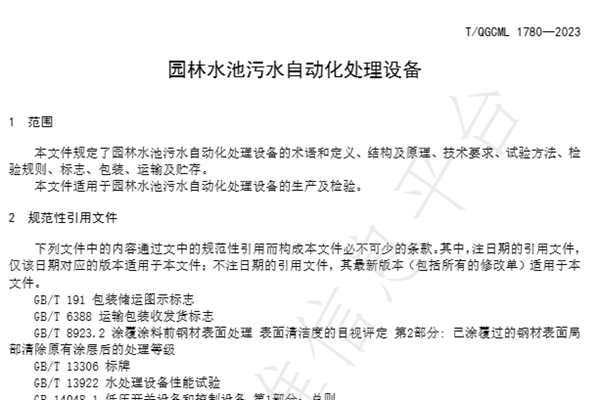 2023年10月24日,《园林水池污水自动化处理设备》(T/QGCML 1780—2023)发布,并定于2023年11月14日起正式施行。文件规定了园林水池污水自动化处理设备的术语和定义、结构及原理、技术要求、试验方法、检验规则、标志、包装、运输及贮存,适用于园林水池污水自动化处理设备的生产及检验。 团标规定,园林水池污...