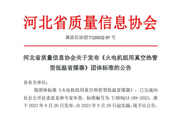 河北省质量信息协会关于发布《火电机组用真空热管型低温省煤器》团体标准的公告 各有关单位: 现团体标准《火电机组用真空热管型低温省煤器》,已完成向社会公开征求意见和专家审查。标准编号为 T/HEBQIA 189-2023,准于2023年9月26日发布,自2023年9月26日起实施,现予以公告。 河北省质量信息协会 2023年9月26...
